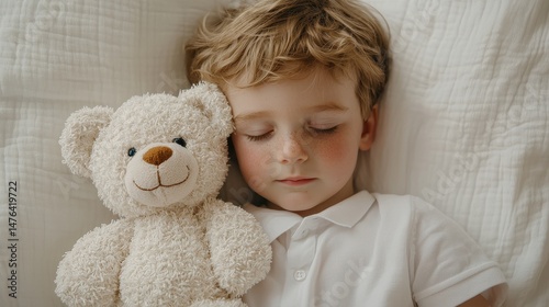 boy, children, sleeping, teddy bear, bed, comfort, innocence, childhood, love, calm, peaceful, rest, emotion, softness, happiness, play, dream, relaxation, cuddling, tender, cosy, warm, home, family, traditional, lifestyle, joy, serenity, cute, adorable, natural light, snuggling, pillow, blanket, joyfulness, calmness, indoor, peacefulness, stillness