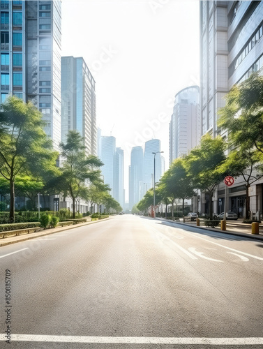 peaceful, urban, street, skyscraper, city landscape, empty, road, tree, sunlight, architecture, downtown, modern, metropolitan, building, tall, perspective, greenery, clean, clear, daytime, financial district, tranquil, business, environment, central, infrastructure, horizon, orderly