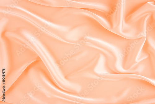 Peach silk background. Wavy folds peach silk texture satin material. Color of the Year 2024. Peach fuzz