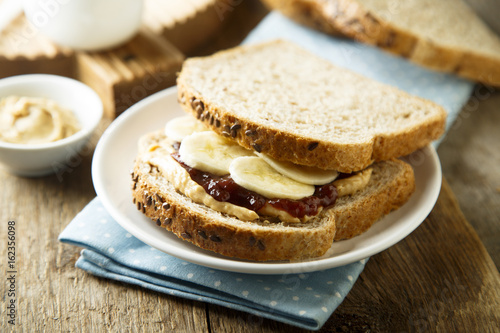 america, american, banana, berry, blue, bowl, bread, breakfast, cooked, desk, dish, food, fresh, fruit, homemade, jam, jelly, lunch, marmalade, meal, napkin, nut, peanut, plate, red, rustic, salted, salty, sandwich, seed, slice, strawberry, sweet, table, traditional, us, white, wood, wooden, peanut butter