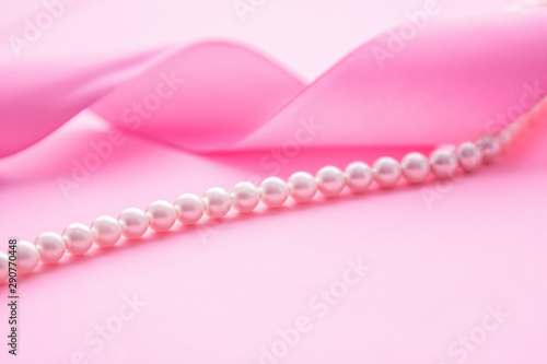Pearl necklace and pink ribbon on pink background