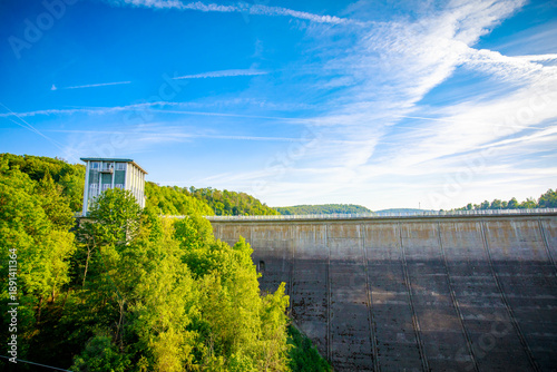 Pedestrian suspension bridge above Rappbodetalsperre lake and Rappbode River in Harz Mountains National Park, Germany