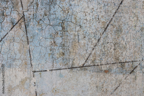 Peeling paint on the wall. Old concrete wall with cracked flaking paint. Weathered rough painted surface with patterns of cracks and peeling. High resolution texture for background and design. Closeup