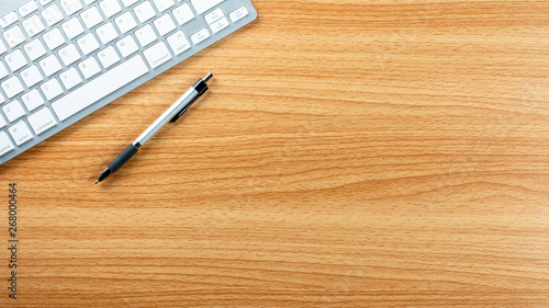 pen and computer keyboard on wooden desk background.