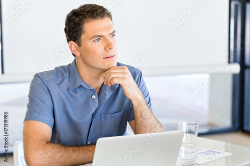 man, business, businessman, desk, sitting, portrait, person, office, work, men at work, male, white, adult, 1, modern, thinking, looking, people, lifestyle, professional, workplace, pensive, young, technology, executive, casual attire, table, caucasian, concentration, worried, job, serious, indoor, space, confident, thinks, working, thoughtful, shirt, imagination