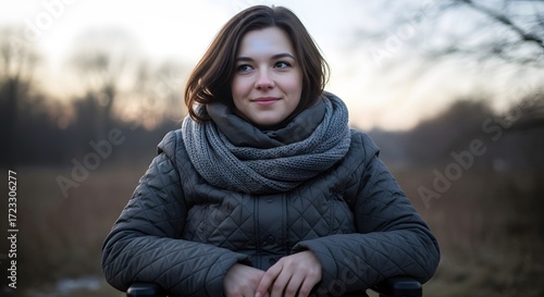 woman, missy, female, portrait, pensive, thoughtful, serene, calm, peaceful, smiling, content, hopeful, contemplative, nature, park, field, winter, autumn, cold weather, warm clothes, foulard, jacket, sitting, lifestyle, candid, natural light, depth of field, blurred background, real people, beauty, wellness, looking away, dark hair, brunette, disability, resilience