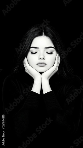 woman, pensive, hand, chin, dark, meditation, relax, portrait, girl, model, beauty, monochrome, female, young, black, white, beautiful, face, eye, hair, head, pose, style, expression, studio, quiet, peaceful, calm, dreaming, thinking, elegance, art, digital, illustration, design, pretty, thoughtful, grieved, sad, depression, grief, melancholy