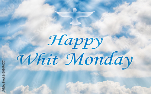 whit, monday, pentecost, holy spirit, may, catholic, holiday, observance, celebration, greeting card, happy, header, web, banner, background, blue, white, pigeon, dove, bird, flying, cloud, cloud, ray, sky, ray, sunlight, flare, christian, peace, hope, day, lent, heaven