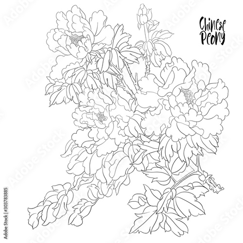 peony, flower, floral, chinese, tree, painting, silk, traditional, batik, branch, leaf, flower petals, botany, botanical, outline, realistic, realism, summer, magic, asian, korea, korean, oriental, china, japan, japanese, element, design, set, line, art, hand, drawing, contour, path, footed, vector, illustration