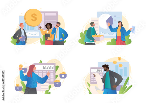 People analyze budget set of icons. Collection of men and women studying financial condition of business or family. Growth of profits. Cartoon flat vector illustration isolated on white background