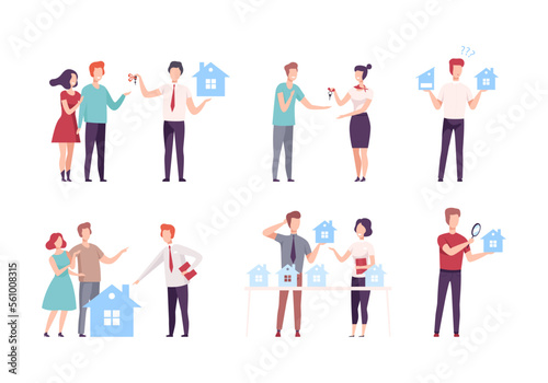 People buying or renting new house set. Real estate agent giving them key to the house flat vector illustration
