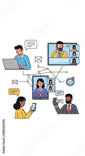 communication, connection, technology, digital, online, networking, device, laptop, smartphone, tablet, screen, conference, collaboration, business, information, datum, cyberspace, virtual, meeting, discussion, people, man, woman, illustration, graphic, concept, modern, global, remote, teamwork, partnership, interaction, sharing, idea, message, connectivity, mobile, desktop, office