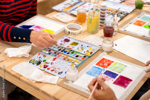 painting, workshop, watercolor, art, creativity, class, hobby, art supply, hand, lesson, artist, studio, learning, drawing, education, leisure, person, workplace, tool, palette, brush, colours, canvas, paper, craft, skill, student, artwork, desk, working, creating, artistic, expressing, avocation, school, training, recreation, hand, detail, closeup, horizontal, people, adult, indoor, teaching, enjoyment, activity, concentration, experimenting