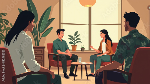 People seated in a group, engaged in discussion in a cozy room with indoor plants and warm light. Concept of dialogue and teamwork. Concept of support group