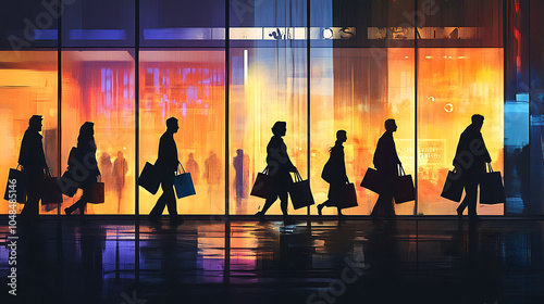 people, walking, past, large, retail, store, window, each, holding, multiple, shopping, bag