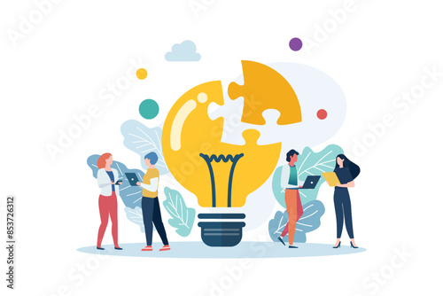 People with big lightbulb jigsaw puzzle. Creative idea concept