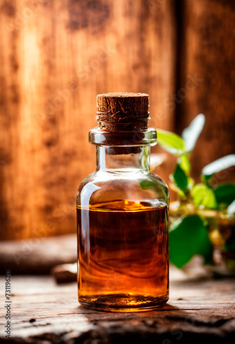 peppermint essential oil in a bottle. Selective focus.