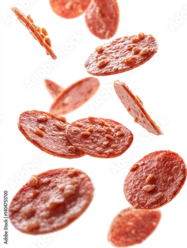 pepperoni, slice, food, motion, culinary, snapshot, red, speckled, texture, appetising, delicious, pizza, topping, ingredient, cookery, photo, studio, white, background, isolated, commercial, advertising, product, marketing, image, crispy, savoury, spicey, italian, gastronomy, epicure, vibrant, palette, composition, dynamic, visual, element