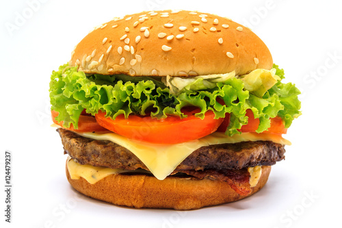 Perfect hamburger classic burger american cheeseburger with cheese, bacon, tomato and lettuce isolated on a white background.