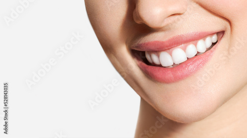 Perfect healthy teeth smile of a young woman. Teeth whitening. Dental clinic patient. Image symbolizes oral care dentistry, stomatology
