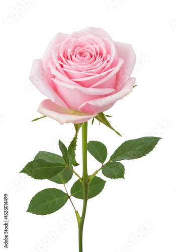 Perfectly formed delicate light pink rose with layered petals and green stem against a transparent studio background. UHD photorealistic high angle studio shot with shadowless lighting, high contrast.