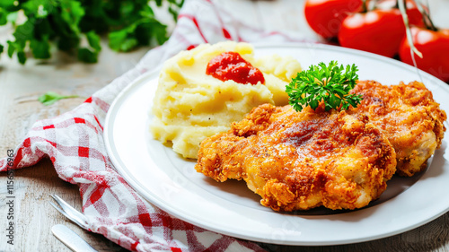Perfectly fried chicken with a golden, crispy crust, served on a white plate alongside creamy mashed potatoes, creating a delicious and comforting meal presentation.