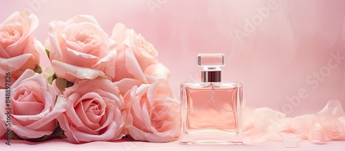 Perfume bottles alongside lovely roses on a pink background with copy space image