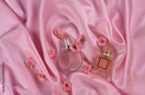 perfume bottles on silk pink fabric with flowers