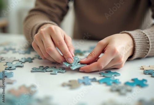 Person Assembling a Jigsaw Puzzle with Focused Hands