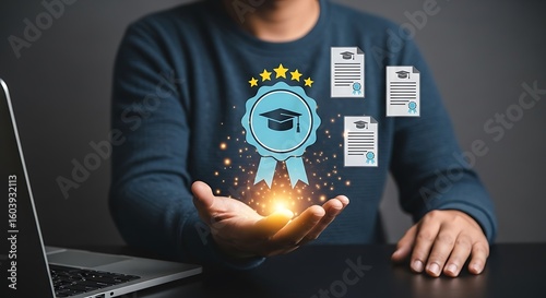 Person displays a glowing award with graduation caps and documents symbolizing academic success
