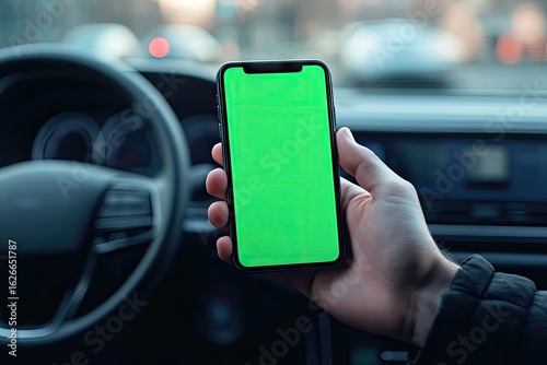 phone, green, screen, hand, car, interior, driving, display, vehicle, dashboard, transportation, technology, mobile, digital, image, closeup, portrait, man, seated, travel, sharpened, casual attire, black, dark, grey, modern, communication, device, user, holding, smartphone, view, inside, street, city, urban, background, blurred
