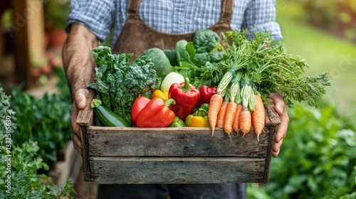 Person holding wooden crate filled with fresh organic vegetables from the garden