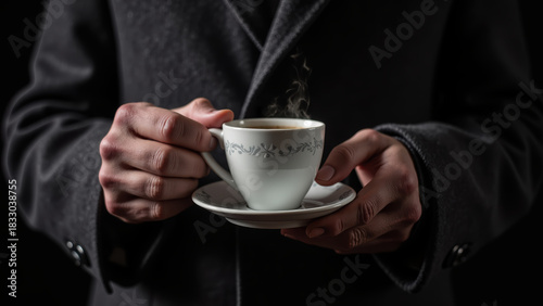 Person holds steaming cup of coffee in delicate porcelain cup, wearing stylish coat. warm beverage evokes sense of comfort and relaxation