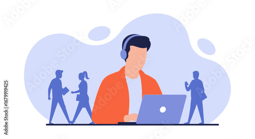 Person in headphones focused on a laptop, surrounded by urban silhouettes. Represents remote work, online communication, and modern productivity.