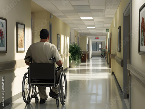 wheelchair, person, hospital, corridor, hallway, wall, floor, lighting, bright, artwork, picture, frame, door, plant, potted plants, shadow, sunlight, window, distance, perspective, patient, caregiver, medicals, health care, building, interior, design, clean, sterile, calm, quiet, empty, beige, white, grey, man, back, view, moving, walking