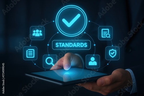 Person interacting with a digital tablet displaying a concept of "Standards" with associated icons, including people, documents, security, and checkmark, set against a dark background, symbolizing...