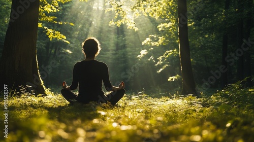 Person meditating in a sunlit forest, symbolizing the tranquility and healing aspects of forest bathing and ecotherapy
