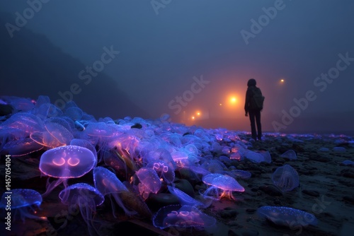 jellyfish, glowing, aglow, ocean, coast, shoreline, water, fog, night, dark, person, walking, backpack, travel, exploration, light, illumination, pebble, beach, strange, aethereal, aquatic, life, marin, nature, environment, scene, mystery, dreamlike, fantasy, surreal, tranquil, peaceful, calming, adventure, discovery, tour tourism, vacation