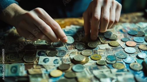 coin, stamp, hand, collecting, sorting, currency, finance, wealth, metal, silver, gold, copper, circular, antique, worn, used, vintage, paper, hobby, investment, valuation, numismatic, collection, detail, close, up, examine, explore, history, art, culture, table, surface, dark, light, shadow, sharpened, finger, holding, arranging, gathering, desk, pastime, interest, object, small