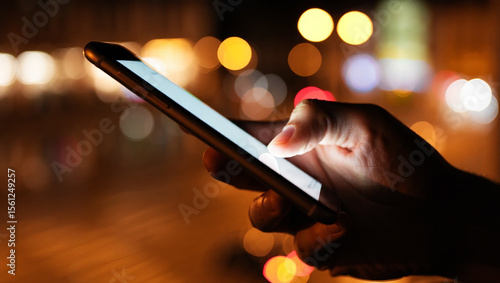 smartphone, hand, finger, touching, screen, night, bokeh, light, blurred, background, technology, communication, urban, evening, dark, illuminated, digital, device, mobile, connection, modern, glowing, out of focus, city lights