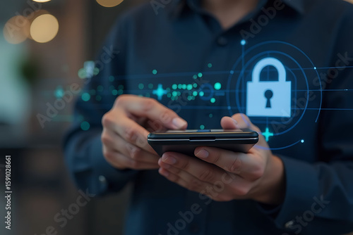 Person Using Smartphone with Security Lock Graphic Overlay