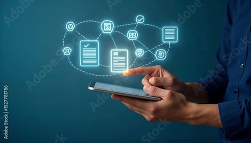 tablet, digital, document, network, icon, interconnected, datum, management, concept, cyan, glowing, technology, information, connection, communication, business, workflow, process, online, mobile, hand, person, screen, interface, app, software, system, file, sharing, collaboration, security, cloud, modern, futuristic