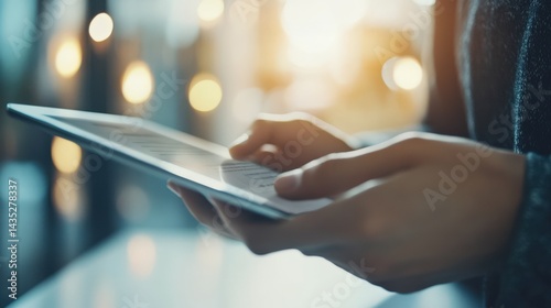 tablet, hand, technology, digital, interaction, warm, bokeh, soft light, modern, sleek, lifestyle, communication, device, user, closeup, casual attire, elegant, reading, social, innovation, business, product, futuristic, screen, connectivity, engagement, contemporary, sharpened, life events, light, visual, design