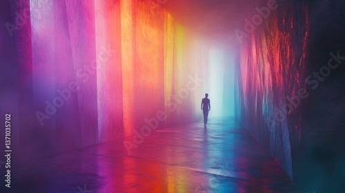 corridor, tunnel, light, colours, rainbow, abstract, walking, silhouette, figure, future, dream, glow, aethereal, passage, unknown, concrete, texture, artistic, vibrant, colourful, hallway, destination, mystery, perspective, hope, journey, solitude, illumination, luminescence, neon