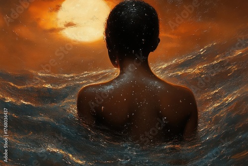 Person with dark skin standing in turbulent water facing a large glowing sun under an orange sky creating a dramatic and contemplative atmosphere