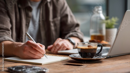 writing, man, notebook, hot drink, laptop, work, desk, table, person, hand, pen, note, learning, education, study, technology, business, casual attire, lifestyle, indoor, home, office, morning, beverage, drink, espresso, dark, caffeine, concentration, sharpened, creativity, idea, planning, research, agenda, day, productive, remote, freelance, entrepreneur, break, leisure, relaxation, inspiration, task, project, meeting, isolated