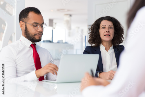Personnel managers interviewing job candidate in meeting room. Business man and woman sitting at conference table with open laptop and talking to employee sitting opposite. Human resource concept
