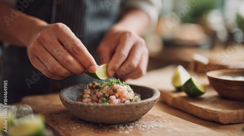 Person's hands holding a lime and squeezing it into a small bowl of food. the bowl is placed on a wooden cutting board and there are several lime wedges scattered around it.