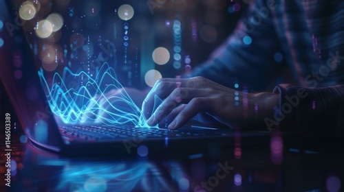 datum, analysis, technology, digital, business, computer, laptop, keyboard, screen, programming, code, coding, cyber, network, graph, chart, line, wave, glow, blue, dark, night, typing, hand, person, workspace, desk, illuminated, modern, work, future, innovation, progress, research, development, science, artificial, intelligence, information