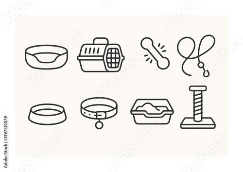 pet, care, icon, set, linear, collection, essential, cat, dog, bowl, carrier, bone, leash, collar, litter, scratching, kennel, animal, cute, accessory, crate, dish, tray, hygiene, domestic, felino, canino, outline, simple, minimal, art, graphic, signs, symbol, pictogram, grooming, tidy, activity, home, decoration, playful, monochrome, furry, companion